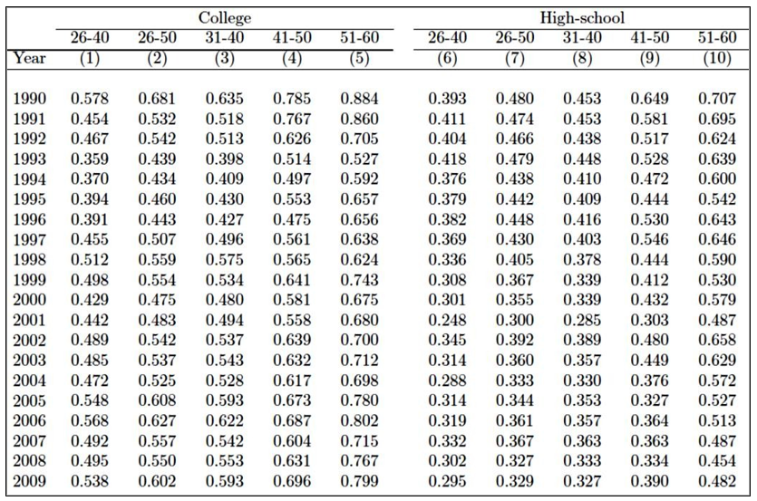 Figure 5 demonstrates that there are variations in the experience premiums between the education groups. The perceived significance of graduates' experience of high school reduced consistently between 1990-2002. Conversely for educated workers is much more distinct. Table A3 is the projected data. The patterns seen in other age groups 26–50, age groups 31–40, and age groups 41–50 (in comparison to the 21–25 age group), demonstrate a significant level of resemblance.