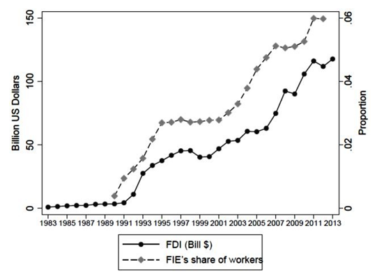 Figure 6: FDI and Employees in FIE (Foreign-Invested Enterprises) in China