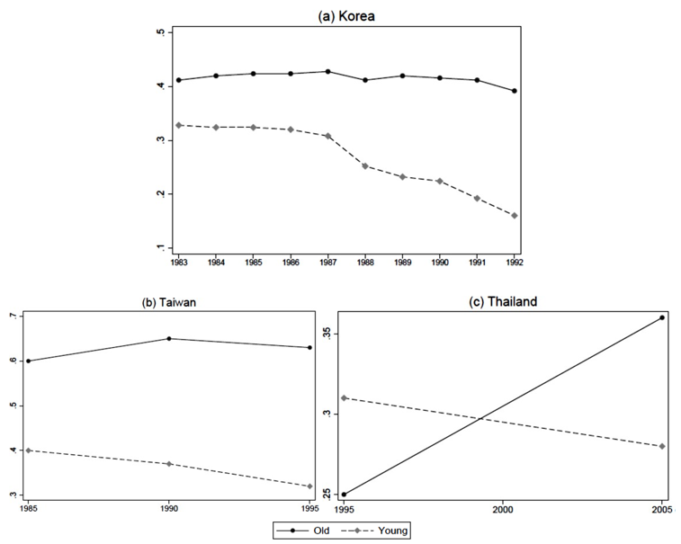Figure 8: Comparative Analysis of College Premiums among Young and Old Workers in Economies Experienced Rapid Growth