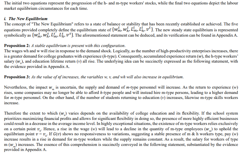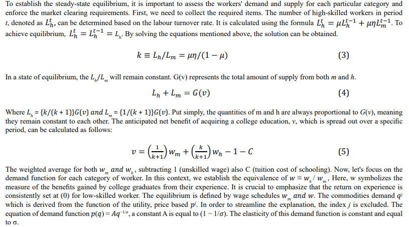 We differ from previous studies in the following ways. First, whereas previous studies have generally focused on one aspect of skill, namely education, We study how experience and education have changed over time. The concept that the availability of experience is typically unresponsive to changes, while the availability of education is adaptable, results in a fascinating interaction. Second, we assume that supply reacts endogenously to demand shocks, in contrast to earlier research that either assumes a fixed number of college graduates or an exogenously variable supply. found that experience or investment and job learning are endogenous [29]. Our model is essentially the same as theirs, with the exception that we do away with endogenous experience selection and concentrate on how labour market dynamics can be explained by the inelasticity of experience supply.