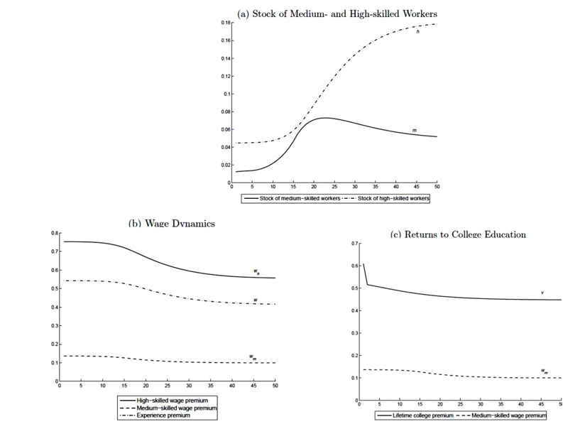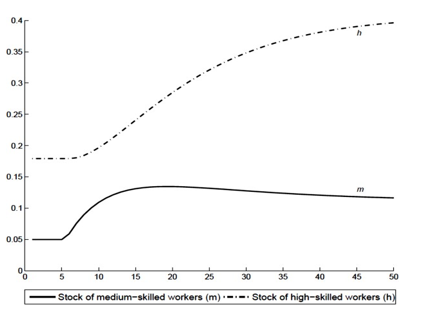 The following policy implications result from our findings. Considering the recent decline in wages, university graduates' salaries have become contentious. The question of whether China has too many university graduates and whether the government should limit the higher education expansion topics discussed in the Republic of China [21,30,31]. Indeed, during the rapid expansion of higher education, comparable issues in non-Ejes Graduates and excessive education have led to other East Asian countries, such as South Korea and Taiwan [2,32]. According to our view, the significant advantages of lifelong learning fully justify individual choice, and this expansion is a response to the rising demand for human capital Our data also demonstrates the need for long-term thinking in human capital development programmes. As we've seen, in the early phases of economic development, education can grow quickly, but gaining experience in the workforce takes time. In certain ways, even while they can temporarily boost college enrollment, emerging nations cannot match the optimal levels of human capital found in established economies. According to Nelson and Pack, the unavoidably protracted process of gathering enough expertise to integrate or assimilate current technologies is the reason why some Asian economies' growth slows down [33]. Raising educational and material standards are vital but by no means adequate, prerequisites for assimilation. Only in the long run do the biggest advantages of educational progress become apparent. China's mainland, Taiwan and South Korea are excellent models. Since the 1980s, enrollment at South Korean and Taiwanese institutions has grown quickly, raising the standard of education and producing a workforce of highly skilled individuals. According to Nelson et al., these two economies are now imitations of innovation [33]. Section 2%'s empirical observations on wages, human capital, and potential economic demand shocks with rapid growth economics comprise the test of the remaining portion. The theoretical model in Section 3 is established, and numerical simulations simulating the reported facts are carried out in Section 4. Section 5 our conclusions.