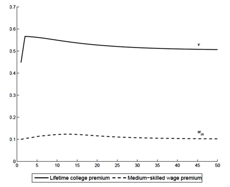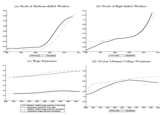 iv. The model failed to anticipate the enduring advantages of education using the Mincer cross-sectional college premium estimation. Next, we will create a theoretical structure and conduct simulations to correspond with these observed events.