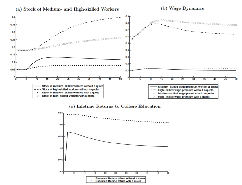 Our initial model assumes that The college enrollment quota surpasses the demand for higher education, ensuring that anyone who wishes to attend college. By assuming this, we can ignore any restrictions on the number of college graduates and instead focus on how worker's choices to enrol in college are affected by a rapid shift in demand. Next, we examine the effects of enrolment quotas on the dynamics of the labour market, either on their own or in combination with a demand shock.