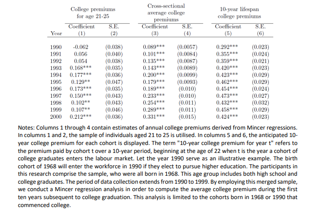 Note: The estimated college premium for a 10-year lifespan is calculated for cohort t, where t denotes the year in which a cohort of college graduates joins the labour market at the age of 22. Consider the year 1990 as an illustration. If the birth cohort of 1968 chooses to pursue higher education, they will join the workforce in 1990. The sample for this study consists of individuals born in 1968, encompassing both college graduates and high school graduates. The data collection period spans from 1990 to 1999. Utilising this combined sample, we do a Mincer regression analysis to calculate the mean college premium over the initial decade following college graduation, specifically for the cohort born in 1968 or the cohort entering college in 1990. The Mincer equation is utilised to estimate the cross- sectional (average) college premium within a given year. The estimation of the college premium for individuals aged 21-25 is conducted based on a sample of workers within this age range.