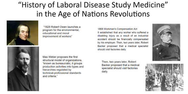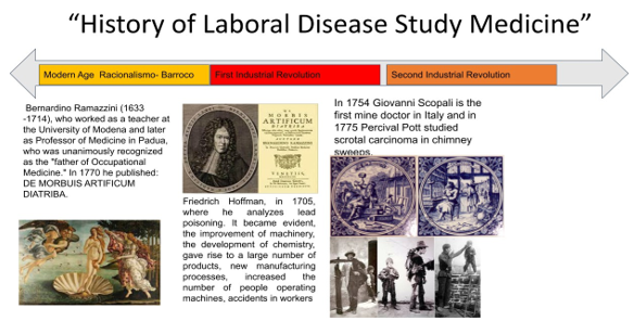 Galen, Marcus Aurelius' doctor, describes poisoning with Copper Sulfate. In the Middle Ages there was a setback in Europe in health issues while the Arabs and Byzantines transcribed the first health codes. In the Early Middle Ages, Maimoides and Ibn Sina dictated the treatises on respiratory diseases and in the late Middle Ages, human reality was separated into 4 substances and this led to the development of the Renaissance and humanism and we have a recovery of the knowledge of the Classical Era and then in During the Renaissance, Bernardino Ramazzini created Occupational Medicine and described “De Morbis artificum diatriba” (the First treatise on occupational diseases in the entire history of humanity) (Figure 3).