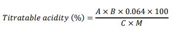 A = NaOH normality, B = NaOH (0.1 mL), M = diluted sample taken (mL), C = diluted sample taken for titration and 0.064 is a constant factor (mL).