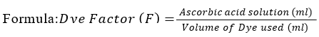 where F = Dye factor, L = mL of dye used, S = mL of dilute solution taken for titration, P = Sample volume for titration