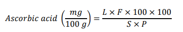 To determine the content of vitamin C, a fruit sample was extracted. The solution was diluted with 0.4% oxalic acid, and the volume was adjusted to 100 mL. A 10 mL sample was taken from the 100 mL solution and titrated against the dye until a light pink color appeared [18]. Three consecutive readings were taken from all the samples. The ascorbic acid content was determined using the following formula: