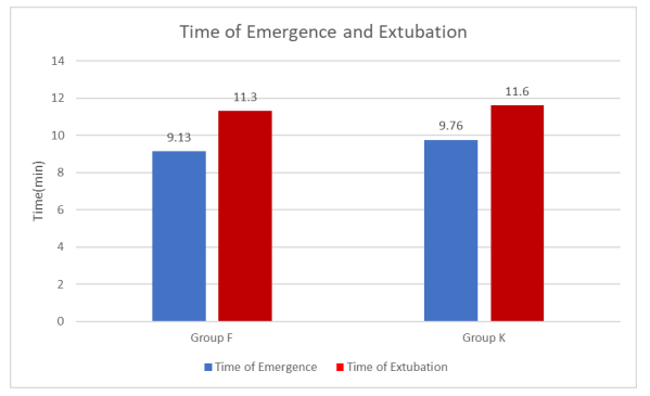 Time of emergence in Group K (9.76±1.9 min) was more compared to Group F (9.13±1.71 min) with p value <0.001 which was statistically significant. Time of extubation in Group K (11.6±1.62) was more compared to Group F (11.3±2.58) with p value <0.001 which was statistically significant.