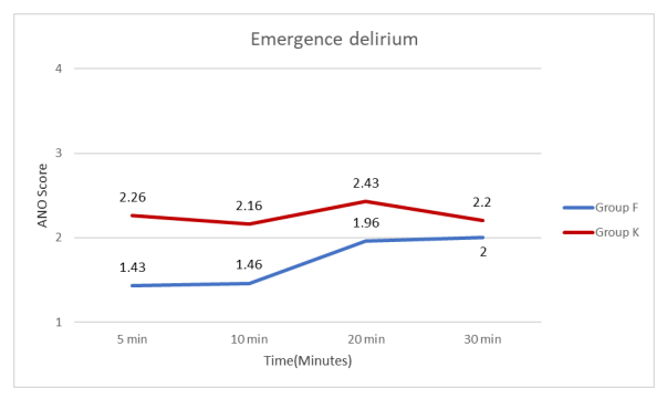 Post-Operative Emergence-Delirium by Aono’s Four Point Scale to assess incidence of post-operative emergence delirium. The score of 3 and 4 are considered as presence of emergence delirium. In our study according to Aono score ED was present in 63.33% of patients in Group K & only 16.66% of patients in Group F at 5 min; while it was 43.33% of patients in Group K & only 10% of patients in Group F at 10 min; at 20 min none of the patients were having ED in Group F while it was 46.66% of patients in Group K. The above finding shows ED was more in Group K compared to Group F.