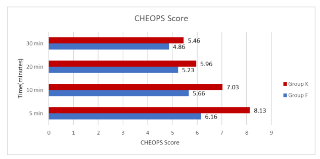 Post-Operative Pain Assessment by CHEOP Score is found to be higher in ketamine group at 5,10,20 and 30 minutes. There is significant difference at 5 minutes (6.16±1.84 in fentanyl group vs 8.13±1.83 in ketamine group) with a p value of 0.0001, at 10 minutes (5.66±1.62 in fentanyl group vs 7.03±1.42 in ketamine group) with a p value of 0.001, at 20 minutes (5.23±0.69 in fentanyl group vs 5.96±0.70 in ketamine group) with a p value of 0.0001 and at 30 minutes (4.86±0.53 in fentanyl group vs 5.46±0.61in ketamine group) with a p value of 0.0001 which is statistically significant.