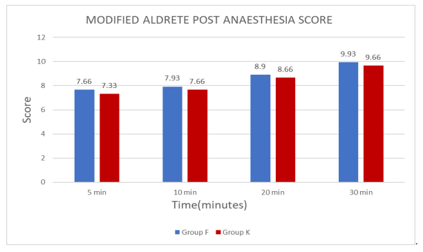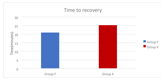Aldrete post-anesthesia score is ≥9, time to achieve this score is recorded as time of recovery, which is more in Group K (22.56±2.78 min) compared to Group F(19.96±2.00 min).