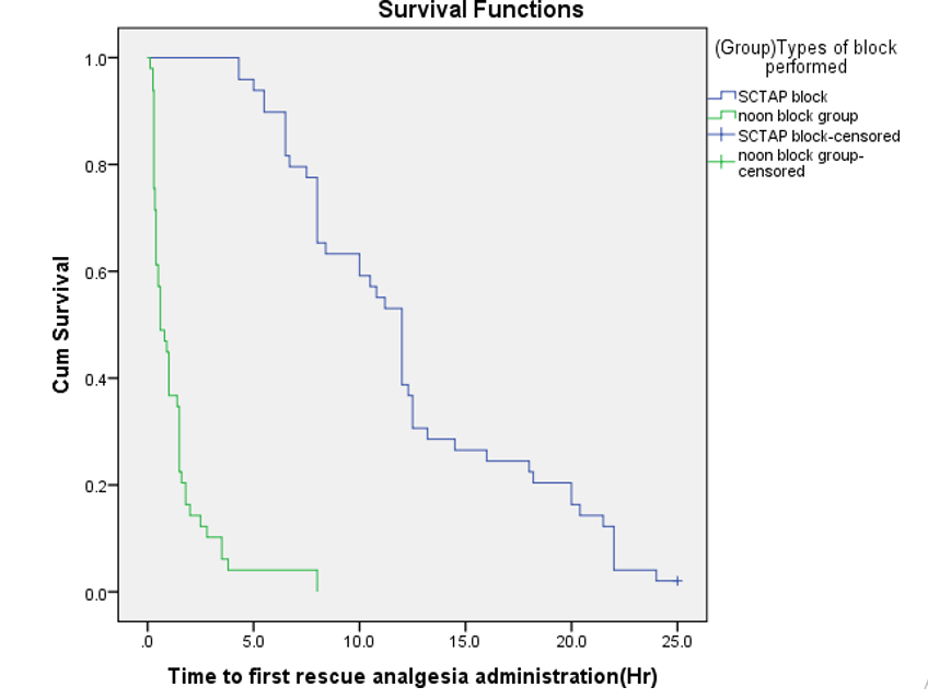 Kaplan-Meier survival curve for first rescue analgesia administration with the patient not receiving any analgesics after 24 hr censored to the right presented in (Figure 2). Log –rank test was obtained between SCTAP block vs. non-block group and (p <0.0001), Patient in the SCTAP block group had significantly longer time to first rescue analgesia administration with median time: 12-hour, 95% CI: [10.997- 13.003] compared to non-block Group, median time 0.4hour,95%CI: [0.136- 0.664]. Cumulative proportion of patient not requesting analgesia at time of 5h after surgery in the non-block group was 1% compared to 90% in SCTAP block group [Figure 2].