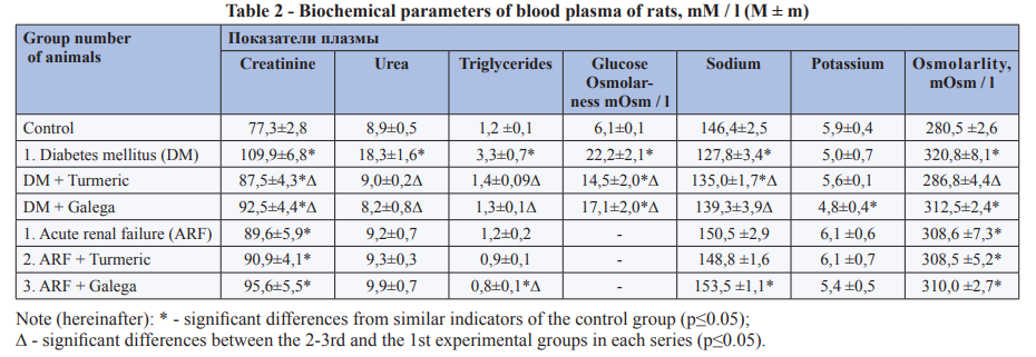 Materials and methods: The experiments were performed in 2 series on male Wistar rats (n = 60) with a model of diabetes mellitus (the 1-st one) and acute renal failure (the 2-nd one). In both series, the animals were divided into 3 groups: rats of the 1-st group were kept on standard feed, the rats of the other groups were got additionally to the feed turmeric (the 2-nd group) or galega (the 3-d group) (2% of feed weight). On the 3-d day of the experiment, the study of diuretic and ionuretic renal functions on an empty stomach and after water loading was performed. The concentration of ions in urine and plasma was determined by flame photometry; osmotic concentration of biological fluids - by cryoscopy; blood biochemical parameters– by colorimetric method.