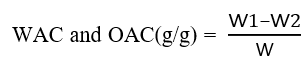 Where: WAC = water absorption capacity, W1 =Weight of centrifuge tube and sample (g), W2= weight of centrifuge tube and sediment (g) w= weight of dry sample (g)