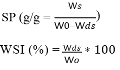 Where: SP = Swelling power, WSI =water solubility index =weight of sediment (g) Wds =weight of dry supernatant(g), and Wo =weight of dry sample (g)