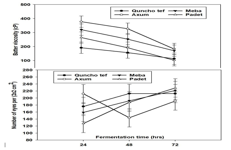 Figure 1: Batter Viscosity (top) and Number of Eyes for Injera (bottom) from the Different Varieties of Finger Millet over Fermentation Time