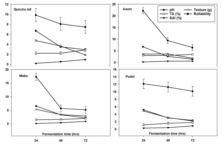 The different physicochemical properties of batter and injera were significantly (p<0.05) varying over the fermentation time shown in Figure 2. The batter pH and viscosity as well as injera hardness and rollability exhibited significantly (p<0.05) decreasing trends over the fermentation time (24-72 hr); which corresponded to increasing levels of TA (although not statically significant), NOE, SAI (p<0.05). The decreasing pH with increasing NOE and SAI was also evidenced by a significant negative correlation (r = -0.4496 and -0.3737, respectively. The decreasing pH is due to the formation of lactic acid by lactic acid bacteria, which resulted in thinning of the batter (reduced viscosity) and softer injera. The increased NOE and SAI levels signify better desirability of injera as the increased NOE and SAI made it better interact with the sauce and get softer and palatable. The decreasing pH can be attributed to lactic acid production by lactic acid bacteria, which in turn, thins the batter (reducing viscosity) and softens the injera, enhancing its palatability [1,6].