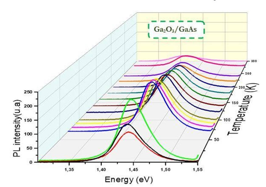 In our structure n= 0, 7: the type of recombination is a transition from the donor state to the acceptor state (D-A), which has already been proven by the work of R. Fornari in which the excitation is done by cathodoluminescence with an energy varying between 5 and 30 KeV [21]. Figure 4 shows the different spectra of the Ga2 O 3/GaAs sample by varying the temperature from 10 to 300 k. An increase in PL inten- sity and width at half maximum is detected in the range of 10 to 60 K. For T<60 K, a drop in PL intensity while increase in LWHM is marked this and justified by the PL intensity ratioI I10 ~10 which I300 shows that this reflects a strongly present non-radiative character due to defects and impurities.
