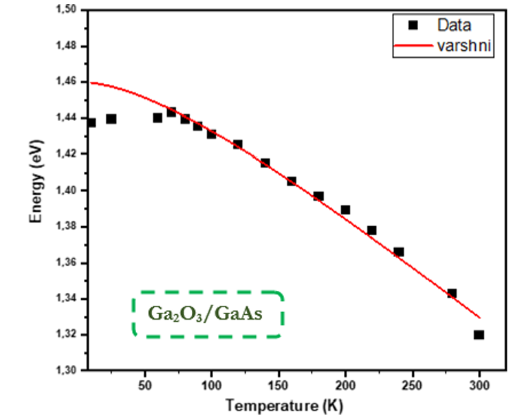 At low temperature, Varshni's law does not correspond to the ex- periment given for the Ga2O3/GaAs epilayer. It exhibits an anom- alous behavior, the so-called S-shape. From 10 to 70 K the emis- sion energy increases, but a decrease is observed between 70 and 100 K. This shape is a signature of the localization phenomenon, which can be related to localized states in the Ga2O3 layer. At high temperature, no distinction can be observed between the expected Varshnienergy band gap and the PL energy peak because the car- riers are thermally delocalized and one joins the evolution guided by band-to-band recombination; this behavior can be attributed to the emission of GaAs.