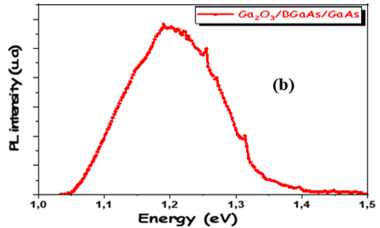 Moreover, they are materials of choice for the development of lasers or detectors operating in the telecommunication domain at wavelengths of 1.3μm [13]. In this context, our mastered heterostructure is based on the III-V semiconductors Ga2O3/ BGaAs/GaAs. The latter generates a new structure applicable in optoelectronics emitting in the 1.3-1.55 micrometer range [12]. The choice of GaAs as substrate due to its high carrier confinement in the active region, its infrared emission and its low cost [14]. The introduction of Boron in GaAs has allowed to decrease the emission energy compared to GaAs and reach the wavelength 1.33 micrometer [15]. Indeed, it acts on the state of strain but it is limited by the incorporation of boron we cannot reach concentrations < 8% this is accompanied by the presence of energy levels in the band gap generally related to boron aggregates (clusters) [16,17]. The advantage of adding Ga2O3 is that it broadens the emission range since it emits in the UV range and is a transparent conductive material [18]. From an energy point of view, these materials have a different energy diagram. In fact,these three semiconductors are distinguished by their band gaps which are 1.42 eV for GaAs, 1.34 eV for BGaAs and 4.6_ 4.9 eV for Ga2O3 [19,20]. In this heterostructure we find energy levels below the BC of BGaAs. Gallium oxide also has deeper energy levels in its optical gap at energies of 2.4, 2.75, 3 and 3.15 eV [21]. These different gap energies make a richness for us in terms of optoelectronic applications.
