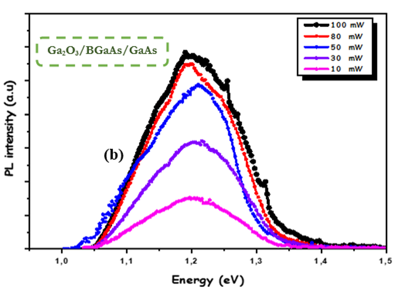 In summary, the study of optical properties by steady-state photo- luminescence of the active layer shows that there is an emission and red shift of about 1.2 eV after low temperature deposition of Ga2O3 on BGaAs/GaAs. However, performance studies highlight the dominance of the Ga2O3 layer in the emission process of the donor-acceptor transition. Boron segregates in the direction of the Ga2O3 layer, resulting in a reduction in boron content and a reduc- tion in tensile stress, resulting in a reduction in the layer. The study of PL as a function of temperature on BGaAs/GaAs structures leads us to conclude that the observed luminescence is the origin of exciton recombination, which is associated with discrete states formed by the aggregation of boron atoms under band gap condi- tions. The luminescence in the new Ga2O3/BGaAs/GaAs structure is governed by the localization of charge carriers in the energy fluctuation potential created by the inhomogeneous distribution of the VGa family.