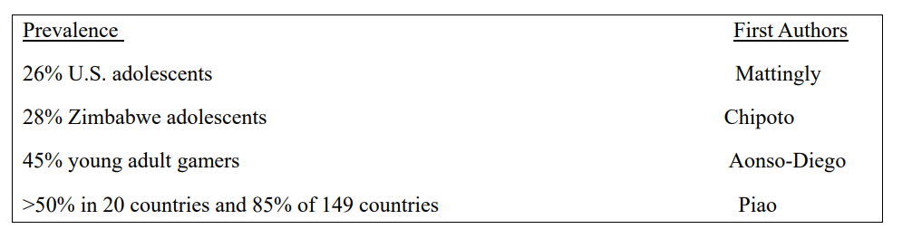 The prevalence of emotional distress has ranged from 26% of adolescents in the U.S. to 28% in Zimbabwe adolescents to more than half the population in 20 countries and has been said to be increasing (see table 1). The data for 26% of adolescents comes from the National Youth Tobacco Survey (N=22,202 11-to-18- years-old) (Mattingly et al, 2024). The data on 28% in Zimbabwe adolescents come from the Violence Against Children and Youth Survey [1]. Data on young adult gamers (N=1209) suggest that as many as 12% had high emotional distress, 33% moderate and 55% low emotional distress [2].