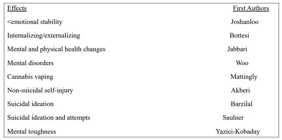 The negative effects of emotional distress have included decreased emotional stability, internalizing and externalizing behaviors, changes in mental and physical health, mental disorders, cannabis use, non-suicidal self-injury and suicidality (see table 2). Mental toughness was the only positive effect that was reported in this literature.