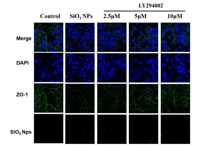Figure 9: Confocal images of BeWo b30 cells treated with the PI3K/AKT inhibitor. BeWo b30 cells were treated with LY294002 at different concentrations (2.5, 5, 10 μM). The tight junction protein ZO-1 was stained, and the cell nuclei were stained with DAPI. Silica NPs (diameter, 100 nm; red) were shown in the cytoplasm.