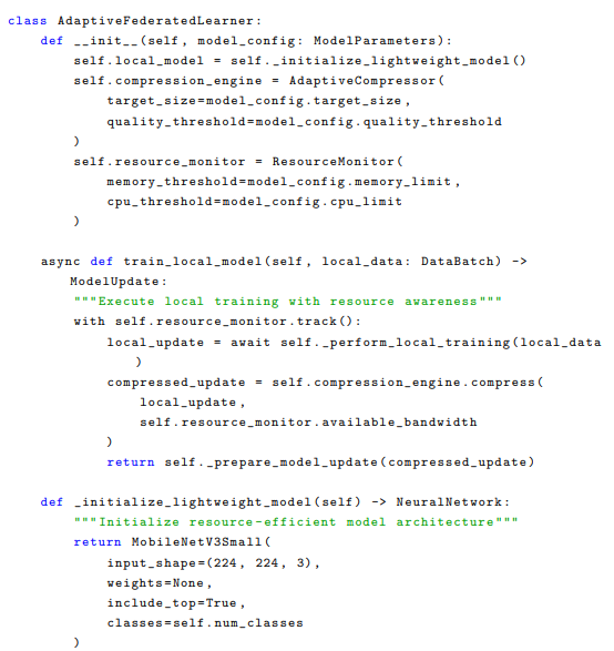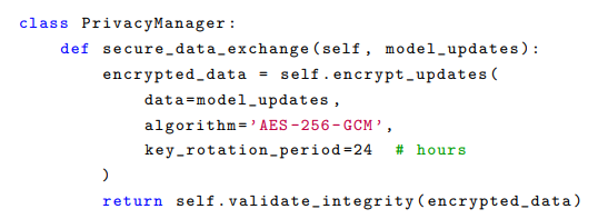 The federated learning implementation incorporates privacy- preserving mechanisms: