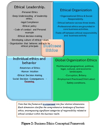 The importance of ethical values within organizations has grown significantly, presenting challenges for leaders. Globalization has increased intercultural interactions, revealing various difficulties and moral dilemmas in navigating diverse ethical standards. Ethics serves as a foundation for moral judgment and a standard for appropriate conduct, providing frameworks for behavior that extend beyond mere regulatory compliance and a clear stans to justify their actions, evaluate their behavior, and promoting accountability and integrity. A critical issue is understanding an organization's ability and responsibility to act ethically within the complex global environment. This qualitative study examines the philosophical and practical aspects of ethical business and its leadership. Based on a thorough analysis and synthesis of 30 primary and secondary literary sources from respected scholars and practitioners. The goal is to develop a comprehensive conceptual framework that captures the essence of business ethics and organizations' understanding that businesses are not isolated entities focused solely on profit but are, in fact, integral components of the larger community. Their roles extend beyond simply providing goods and services; they are also pivotal in fostering social cohesion and enhancing workplace dynamics. By engaging in ethical practices, businesses contribute to a positive community environment, promote trust among consumers and stakeholders, and enhance overall societal well-being. Business ethics is not merely a moral obligation; it is a strategic imperative that aligns business success with the health and prosperity of the communities in which they operate. Companies can create a positive feedback loop where ethical practices lead to business growth, which in turn benefits society.