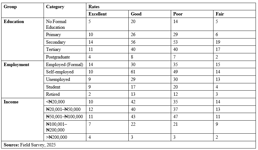 The analysis demonstrated a clear relationship between individual-level socio-economic status and health outcomes. Respondents with tertiary and postgraduate education recorded the highest frequencies of “Excellent” and “Good” self-rated health, whereas those with no formal or only primary education were disproportionately concentrated in the “Fair” and “Poor” categories. The health profile was also most favorable among those with formal employment, while unemployed and retired individuals reported worse outcomes.