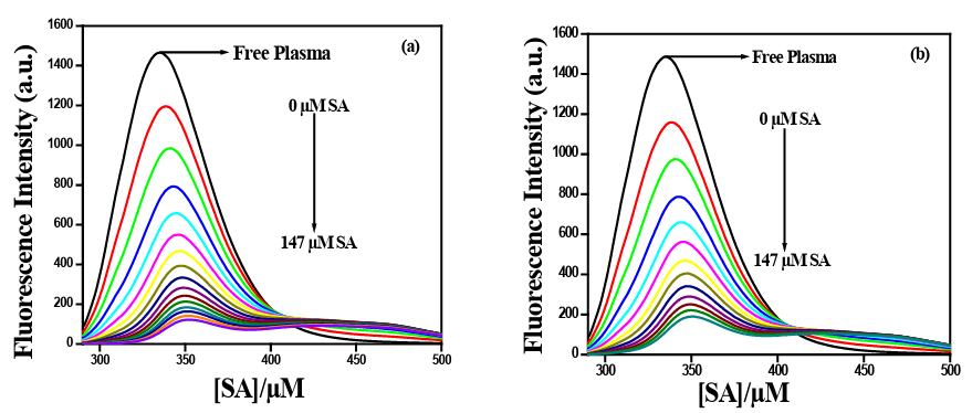 Figure 1: Fluorescence quenching spectra of plasma protein (albumin) in the presence of varying concentrations of SA at 298 K; λex= 280 nm, pH = 7.4 (0.1N PBS). Excitation band pass =5 nm and Emission band pass = 5 nm. (a) alcohol/buffer medium; (b) DMSO/buffer medium.