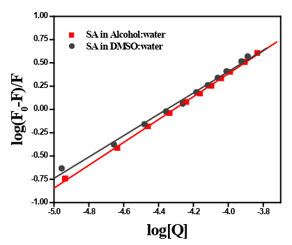 Figure 2: The double-logarithm plot of log[(F0-F)/F] vs. log[Q] for the interaction between human blood plasma with SA in two different media.