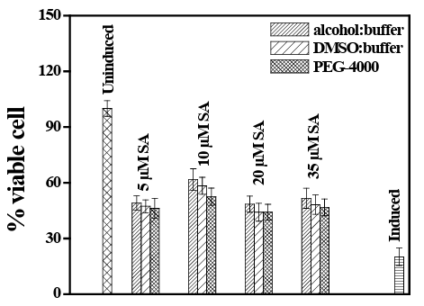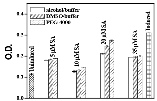 We have chosen three solvents: SA dissolved in alcohol, SA dis- solved in dimethyl sulfoxide (DMSO) and SA dissolved in 13% PEG-4000 as stock solutions for solvents. The binding constant of SA in these three solvents with albumin has been judged cru- cially to follow the extent of SA delivery to the biological system and carrying of SA in the system by binding with albumin. The stock solution for PEG, alcohol and DMSO were 20%. 14µl of SA (0.00224 gm SA in 2 ml of stock solution, i.e, 400µl alcohol in 1600 µl H2O) in 20% alcohol was dissolved in 1986 µl of PBS to meet the final concentration as 0.01%, which is then used to incu- bate cells. Similarly, the final concentration of DMSO is 0.005% and PEG is 0.01% in working solution in which the peripheral blood mononuclear cells were cultured and incubated for further study.