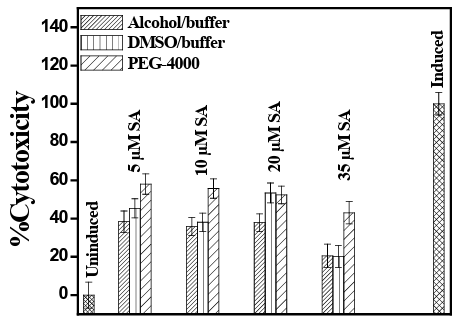 LDH level is an indicative of cellular death. The percentage of cyto- toxicity induced by UVB and its amelioration by co-administration of SA showed interesting results. The percentage of cytotoxicity in case of SA administered through alcohol/buffer system was in the order of 5µM (38.49%)>20µM (37.92%)>10µM (35.78%)>35µM (20.68%) and that for DMSO/buffer media was 20µM (53.15%)>5µM (45.10%)>10µM (38.18%)>35µM (20.15%) and in case of SA in PEG medium that result was 5µM (58.03%)>10µM (55.69%)>20µM (52.33%)>35µM (43.00%). The observation primarily indicated that a concentration of 35 µM of SA was able best to prevent cell damage against UVB. Interestingly, the optimum concentration for alcohol/ buffer, DMSO/buffer and SA in PEG/buffer medium was 35µM. The percent cytotoxicity for alcohol/buffer, DMSO/buffer and PEG /buffer media was also comparable to each other (vide Figure 5). We have also studied the experiment with 1µM SA which showed a poor ame- lioration from UVB induced damage. The level of LDH before and after administration of SA in UVB exposed PBMC was significantly different (p<0.01) between 5 and 35µM of SA (p<0.05).