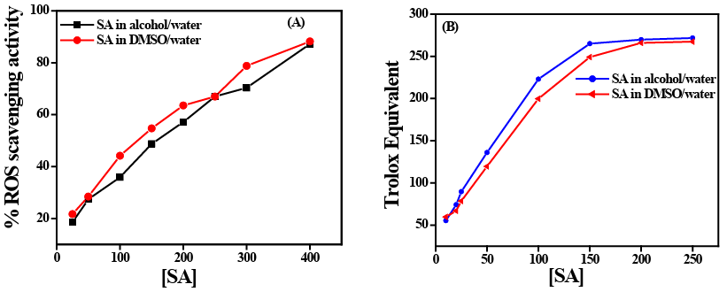 ABTS assay measure the relative ability of an antioxidant to scav- enge the ABTS generated in the aqueous phase, as compared with Trolox (water-soluble vitamin E analog) standard. The ABTS is generated by reacting with a strong oxidizing agent with the ABTS salt. It is a decolouration assay applicable to both lipophilic and hydrophilic antioxidants. The assay was performed according to the protocol of Re et al. [20] with different concentration of SA (1, 5,10, 20, 30 and 50µM), in which radical monocation of ABTS.+ (2,2’ azinobis-3 ethylbenzothiazoline-6-sulfonic acid) is generated by oxidation of ABTS with potassium persulfate and is reduced in the presence of such hydrogen donating antioxidants. This assay was also performed in two different solvent system of SA, alcohol water and DMSO water.