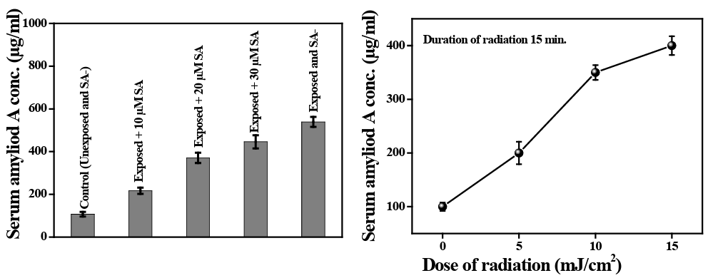 Serum amyloid A (SAA) is an apolipoprotein and a major acute phase reactant which has a central role in the inflammatory re- sponse. SAA is expressed primarily in the liver, although it is also found in extrahepatic sources such as adipocytes and macrophages. SAA is involved in cholesterol sequestering and lipid metabolism and has been shown to induce extracellular-matrix-degrading en- zymes, pro-inflammatory cytokines and to recruit immune cells to sites of inflammation by chemotaxis [26]. Radiation can induce SAA in rodents and other primates [26]. Here we have shown that UVB induces SAA at a significantly high level (p<0.05) in com- parison to normal unexposed PBMCs. Radiation-induced SAA ex- pression is increased to show a dose-response relationship (data not shown here, when gradually the time of exposure has been in- creased from 5 min to 25 min). 15 min UVB exposure with graded concentrations of SA can reduce the SAA concentration in com- parison to UVB exposure without SA, although did not attain the normal unexposed level (Figure 8).