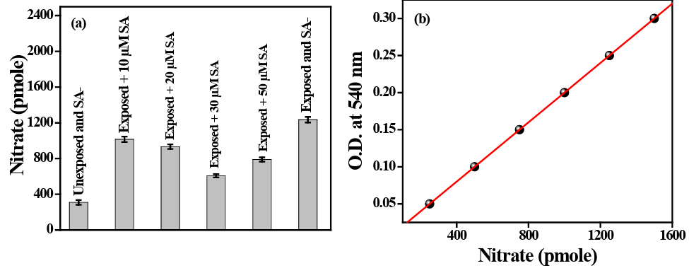 Figure 9: 9a represents the pmole concentration of nitrate evolved against OD level at 540nm. 9b represents the concentration of nitrate evolved in cells after UVB exposure with and without SA administration.