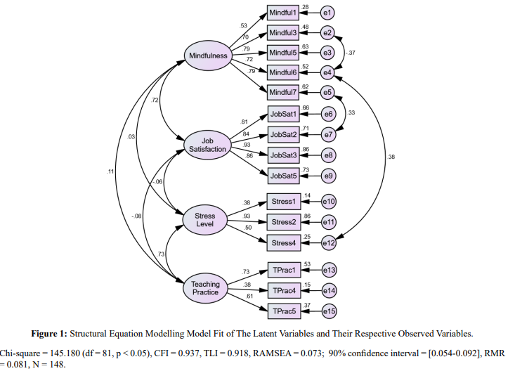 Structural Model: The SEM revealed mindfulness has the strongest influence on job satisfaction, followed by teaching practices and stress levels.