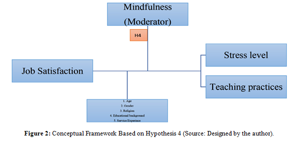 Initially, for mindfulness it was 8 and reduced to 6, for stress level it was reduced to 4 from 5, for teaching practice it was reduced to 4 from 5 and for job satisfaction no questions were removed. Hypotheses were tested using Pearson correlation analysis, two- tailed tests, and linear regression analysis to identify whether there is a significant relationship that validates the hypotheses. Multiple linear regression analysis investigated the moderating effects of mindfulness, based on the method established by Professor Andrew Hayes, particularly concerning stress levels, teaching practices, and job satisfaction. A conceptual framework was developed and analyzed. Since significant moderating effects were found, slope analysis was performed to convert continuous variables into categorical variables, followed by slope analysis for moderating effects.