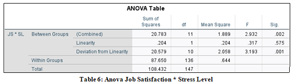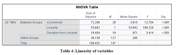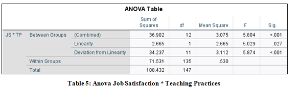 A reliability analysis was conducted (refer appendix) on the five- item Job Satisfaction (JS) scale, designed to measure the job satisfaction levels of teacher-trainers. The scale demonstrated excellent reliability, with a Cronbach’s alpha of 0.940, indicating a very high degree of internal consistency. The corrected item-total correlations ranged from 0.782 (Job Satisfaction 1) to 0.900 (Job Satisfaction 3), showing strong correlations between individual items and the total scale score. The “Cronbach's Alpha if Item Deleted” values ranged from 0.915 to 0.936, confirming that the removal of any individual item would not significantly improve the overall reliability of the scale. The overall scale had a mean of 19.38, a variance of 18.441, and a standard deviation of 4.294. These results indicate that the five-item Job Satisfaction (JS) scale is a robust and reliable tool for assessing job satisfaction among teacher-trainers. The exceptionally high Cronbach’s alpha value of 0.940 exceeds the commonly accepted threshold of 0.70, confirming the strong internal consistency of the scale. The high corrected item-total correlations and minimal improvement potential in alpha values upon item deletion further support the scale's validity. These findings suggest that the five-item Job Satisfaction (JS) scale effectively captures the construct of job satisfaction in teacher-trainers and is suitable for use in exploring its relationships with other variables, such as mindfulness, stress levels, and teaching practices