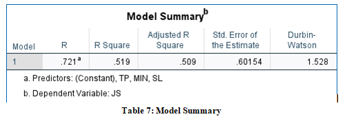 Constant (1.375): When all predictors (MIN, SL, TP) are zero, the baseline level of Job Satisfaction (JS) is 1.375. Mindfulness (MIN, B