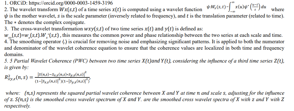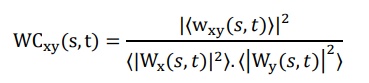 Wavelet coherence WCxy(s, t) provides a localized correlation measure between the two time series across different frequencies and times. It is particularly useful in identifying time-frequency regions where the two signals exhibit high coherence, indicating potential underlying relationships or interactions that might not be apparent in the time domain alone. Unlike traditional coherence measures, wavelet coherence allows for the examination of the relationship between signals at specific time intervals and frequency bands. The method involves complex computations, especially in the transformation and smoothing steps. Wavelet coherence is widely used in various fields, including neuroscience, economics, climatology, and engineering, to analyze non-stationary signals [20].
