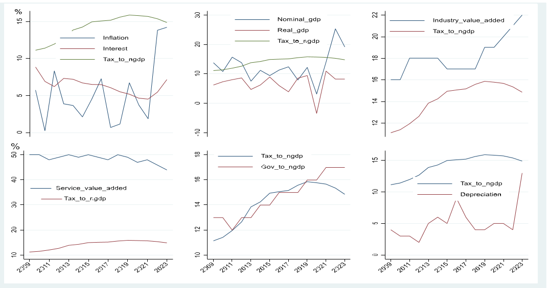 The analysis starts with data visualization in trend to see historical trends on the interesting variables. The figure1 showcases various economic indicators alongside the tax-to-GDP ratio over time, revealing notable trends and relationships. Despite increases in both interest rates and inflation, the tax-to-GDP ratio declines. This aligns with the economic theory suggesting that higher interest rates and inflation can suppress economic activity and reduce tax revenues, as increased costs of borrowing and living can stifle growth and limit taxable income [21].