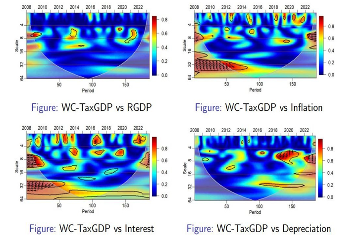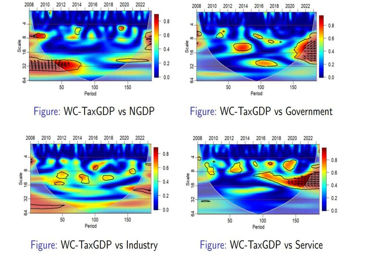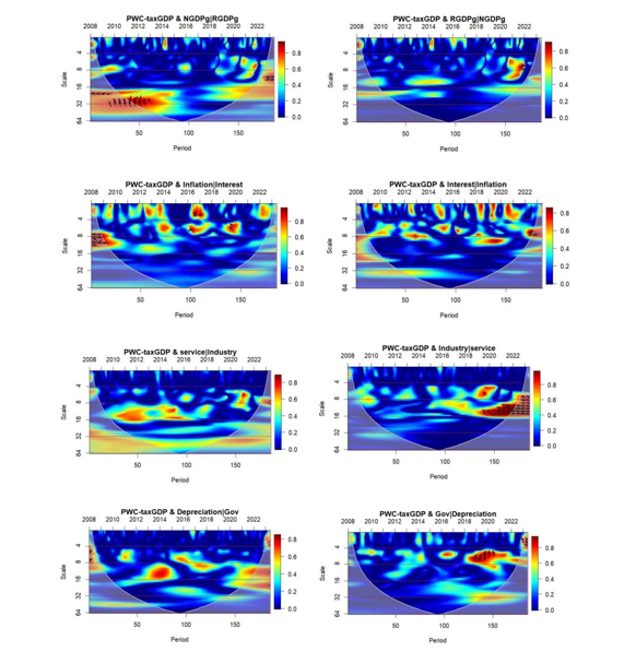 An increasing alignment between tax revenue and the service industry, especially after 2018, suggesting a growing impact of this sector on tax generation. The second plot reveals periodic coherence between tax-to-GDP and industry, influenced by service sector dynamics, with notable alignments around 2014 and 2020. In the third, the interaction between tax-to-GDP and depreciation, modulated by government policies, shows variable coherence, indicating the influence of fiscal policies on this relationship. Lastly, the coherence between tax revenue and government spending, affected by depreciation rates, points out significant periods like 2014 and 2018 were fiscal activities and depreciation collectively impacted tax revenues These insights are crucial for understanding the sector-specific impacts on tax revenue, aiding in more informed economic and policy analysis.