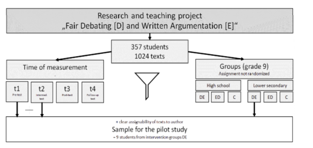 To address the central research question (see Section 1) regarding the development of persuasive writing in pro-and-con argumentation essays before and after debate training, the essays from all non- academic-track students in the DE group were analyzed at time points t1 and t2 (see Figure 2). It was crucial that each essay could be definitively matched to an anonymized student ID in order to track individual development over time.
