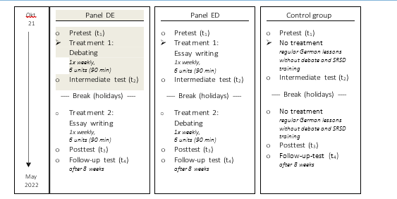 The instructional design was informed by the structured debates mentioned in Section 2.1 and the Self-Regulated Strategy Devel- opment (SRSD) framework for teaching writing [21,22]. Each unit comprised six 90-minute sessions, implemented weekly during regular language lessons. Random assignment within classes fol- lowed an alternating-number procedure, creating two treatment groups: DE (first debate, then essay writing) and ED first essay writing, then debate). This enabled analysis of possible sequence effects on students’ argumentation skills. The present sub-study focuses exclusively on the DE group from non-academic-track schools, as these students had no prior exposure to the pro–con argumentative essay genre.