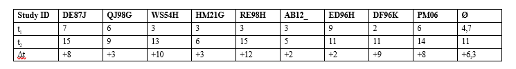 Table 2 shows that six of the nine students improved between the first measurement point (t1) and the second measurement point (t2) after completing debate training. Student WS54H deserves special mention, as they achieved a rating improvement of 1.5 points, which is significantly higher than the average improvement. Table 3 below shows the number of ADUs (i.e., the number of arguments) at both measurement points (t1, t2), which were determined from the qualitative argument structure analysis. The table below presents the number of ADUs identified in each student’s essays at t1 and t2.