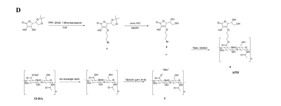 Briefly, an alkyl group is introduced into the hydroxyl group at C3 of ascorbic acid protected in the form of an acetal using the Mitsunobu synthesis method, and then the protective group is removed. This compound was reacted with hyaluronic acid tetrabutylammonium salt in DMSO for about 24 hours to obtain the final compound, ascorbyl propyl hyaluronate (APH). In more detail, the synthesis of APH consists of the following four steps: 4-(3-bromopropoxy)-5-(2,2-dimethyl-1,3-dioxolan-4-yl)-3- hydroxyfuran-2(5H)-one (1): To a stirred solution of Ph3P (1.2 eq) in dry THF at 0ºC was added DIAD (1.2 eq). After 15 minutes at 0ºC, white solid (Mitsunobu betaine) was formed. Stirring was continued at 0ºC for additional 10 minutes. Then a solution of L-Ascorbic-Acid-Acetonide (1 eq) in THF was added. After 5 minutes, the mixture was treated with 1-bromopropanol (1.2 eq) and stirred for 3 hours at RT. The solvents were removed under reduced pressure. The resulting oil was purified by column chromatography on silica gel (1:1 hexane/EtOAc) to give a viscous.